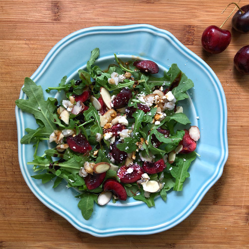 In a large bowl add arugula, barley, and cherries. Toss gently to combine.